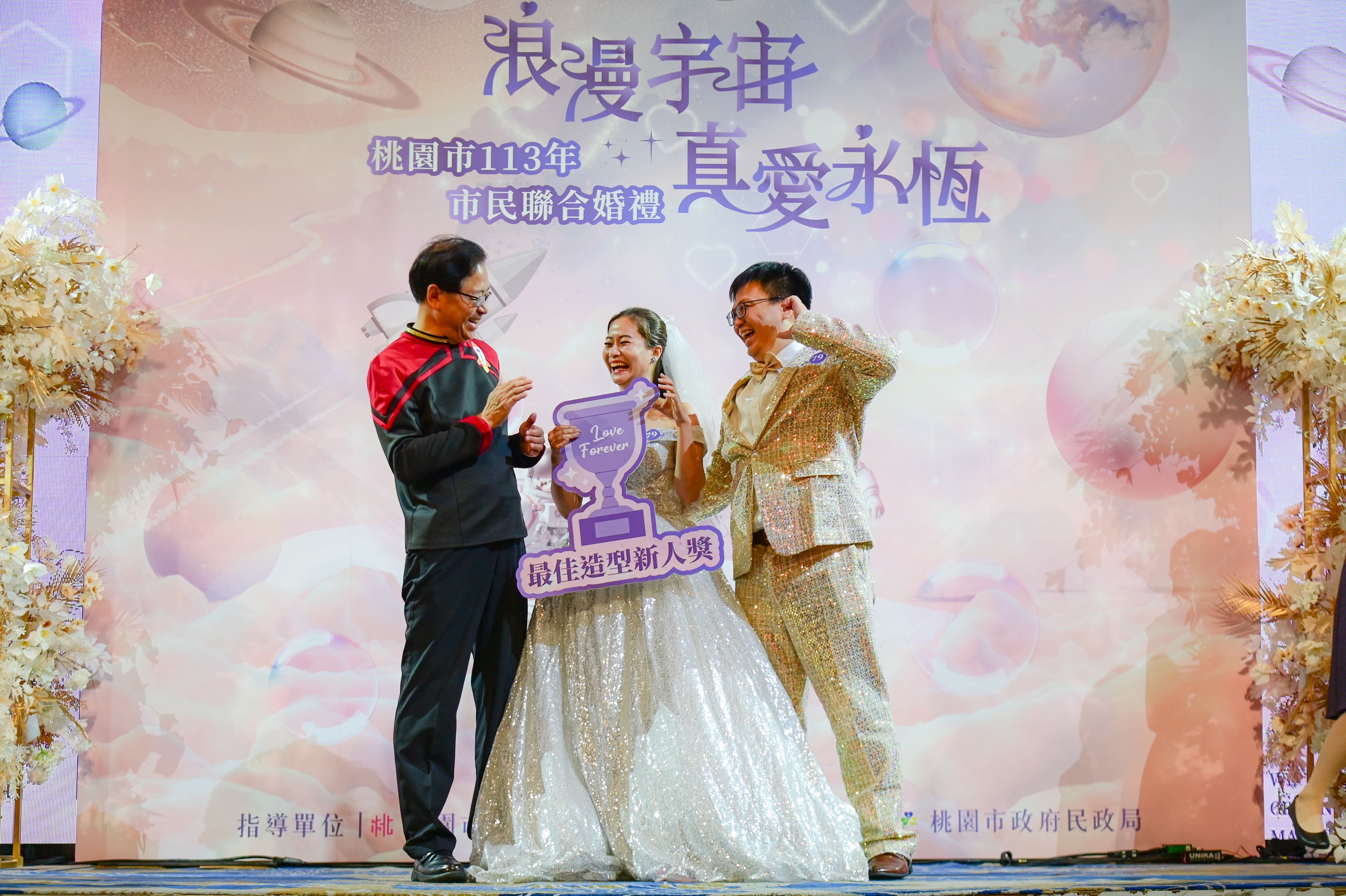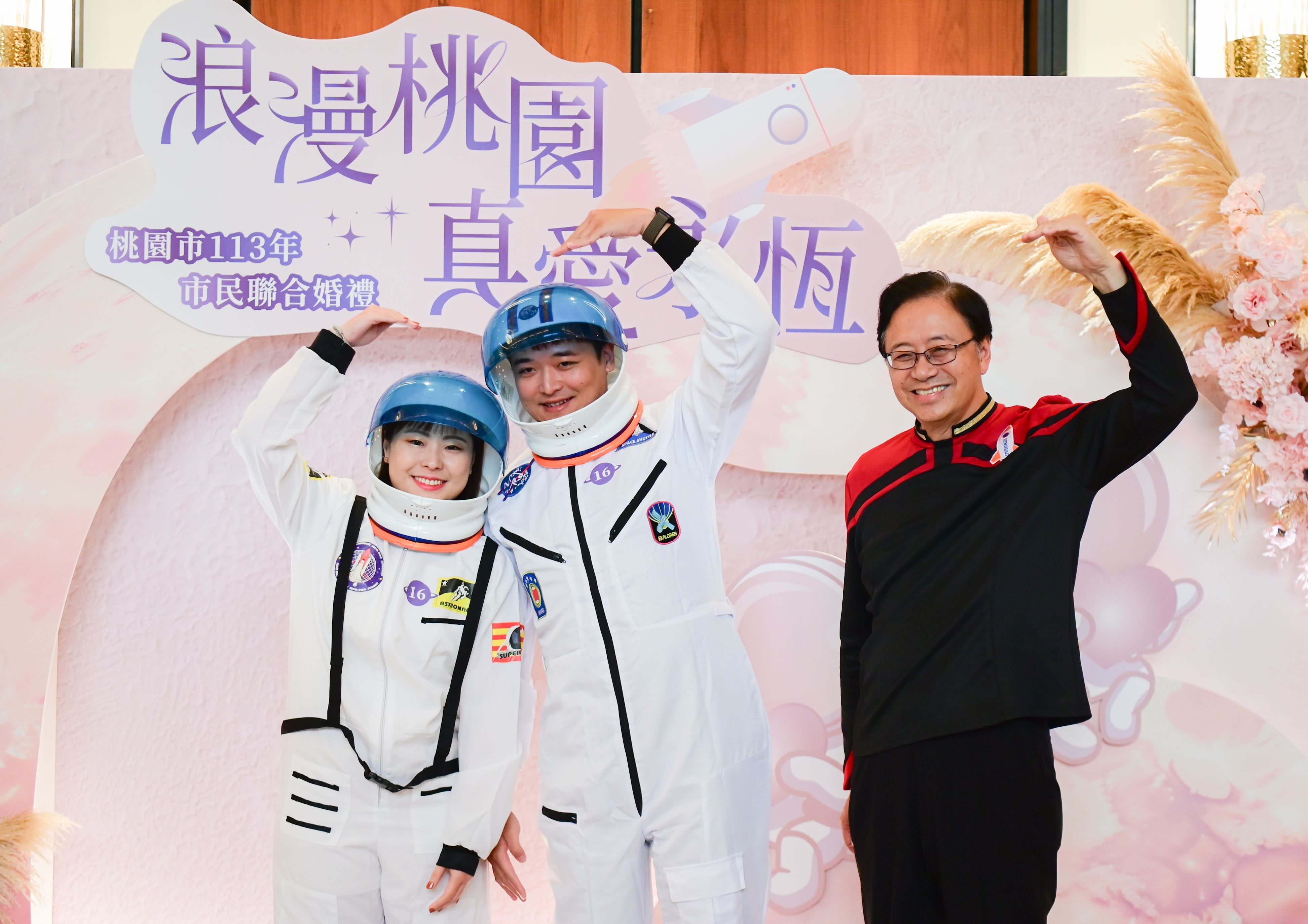 桃園市政府於113年10月26日在桃園區皇家薇庭舉辦「浪漫宇宙 真愛永恆」113年市民聯合婚禮,市長張善政特別化身宇航員前來沾沾喜氣,並向在場80對新人送上最誠摯祝福,恭喜新人喜結連理,祝福大家的愛情都能如無窮無盡的宇宙般,長長久久、永遠無窮。